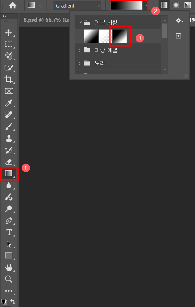 이제 단축키 G 또는 Gradient Tool를 눌러서 이미지 순서대로 진행해준다.