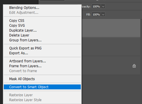 이제 Layer 1 레이어를 클릭하고 마우스 오른쪽 버튼을 클릭해서 아래 Convert to Smart Object를 클릭해준다.